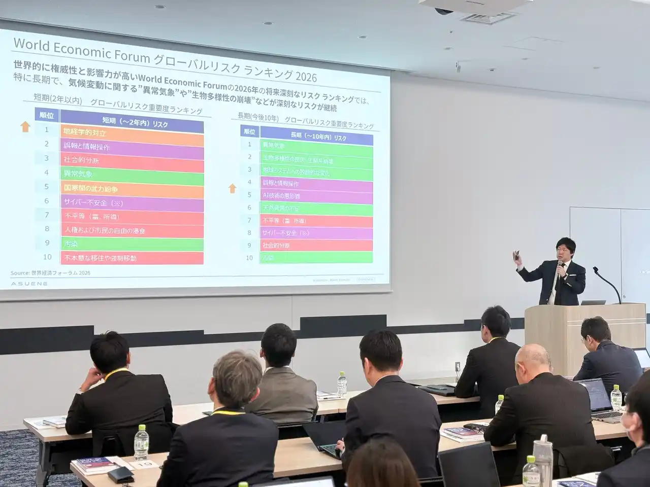 続いて、上級執行役員CPO 渡瀬は、「ASUENE」ソリューションのアップデートと方向性について説明しました。現在も多くの企業では、排出量の算定がExcelやメールを中心に管理されている現状に触れ、拠点ごとの属人化やデータ整合性の課題を指摘しました。そのうえで、APIでのデータ連携による業務効率化、入力フォーマットの標準化、ESG・サステナビリティ情報の統合管理、開示基準への対応機能、AIを活用したレポート作成支援など、算定から開示までを一連のプロセスとして設計する取り組みを紹介しました。 |