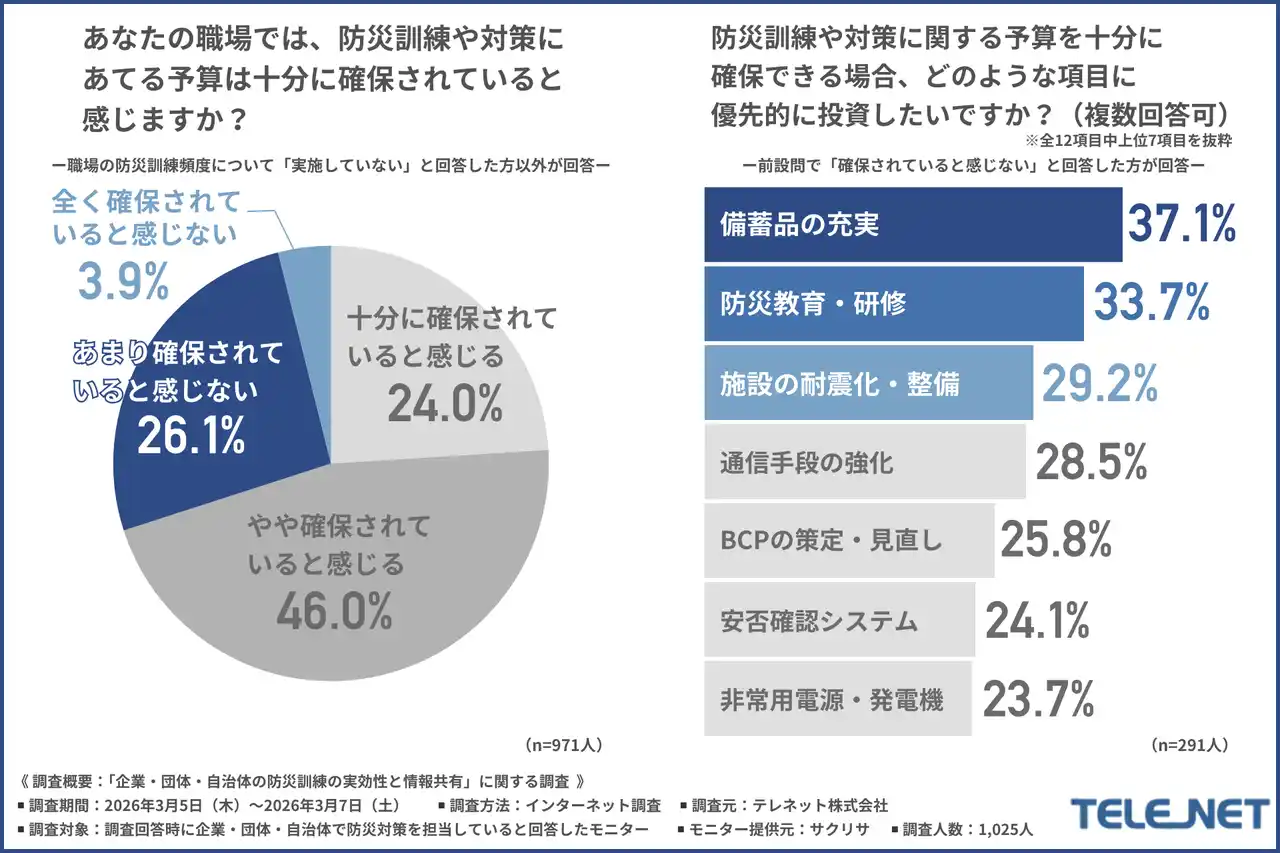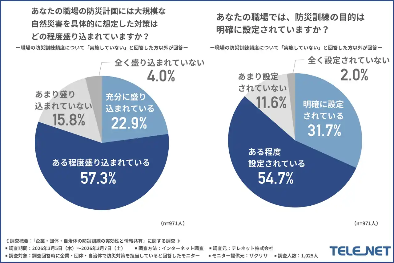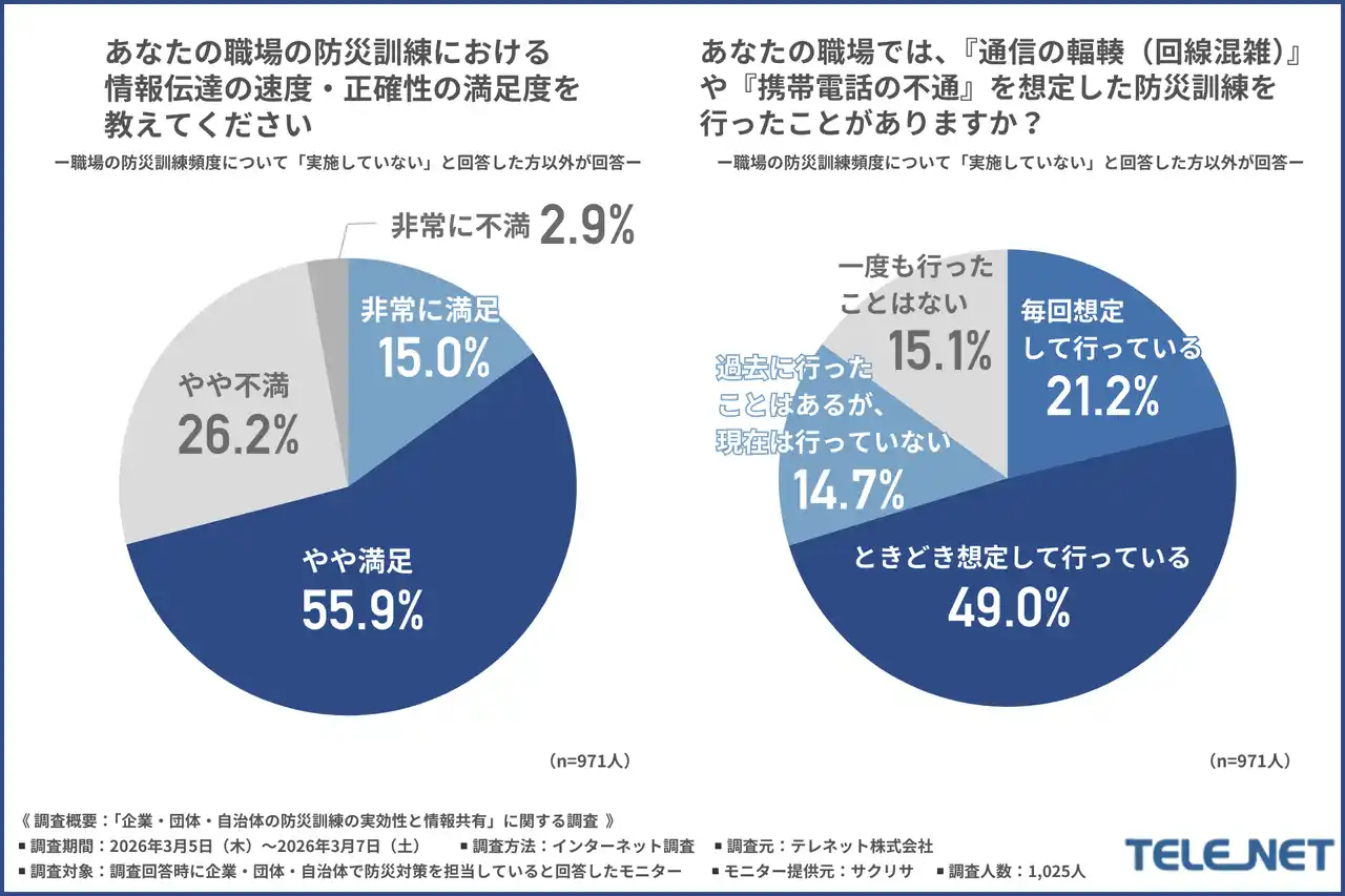 テレネット株式会社(所在地:長野県飯田市、代表取締役:青山 貴子)は、企業・団体・自治体で防災対策を担当している方を対象に、「企業・団体・自治体の防災訓練の実効性と情報共有」に関する調査を実施しました。