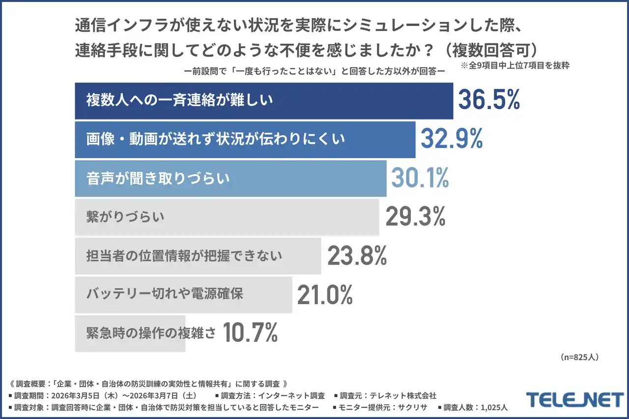 最後に、前問で『一度も行ったことはない』と回答した方以外に、「通信インフラが使えない状況を実際にシミュレーションした際、連絡手段に関してどのような不便を感じたか」について尋ねたところ、『複数人への一斉連絡が難しい(36.5%)』と回答した方が最も多く、『画像・動画が送れず状況が伝わりにくい(32.9%)』『音声が聞き取りづらい(30.1%)』と続きました。 |