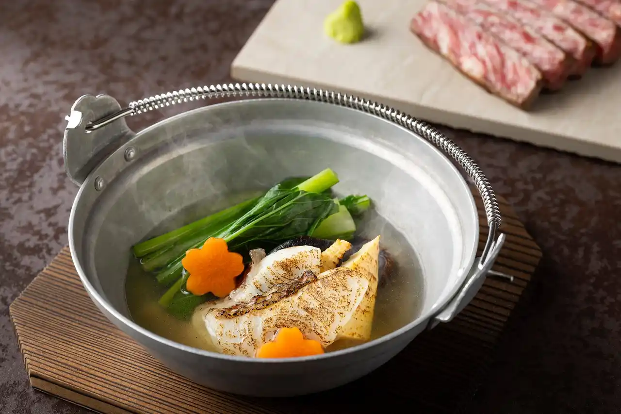 前菜は、ホタルイカやたけのこなど三種のお料理を盛り合わせ、春の訪れを感じる一皿に仕上げました。続く「近江牛」は、肉寿しをイメージし、手早く炙った牛肉を温かい寿し飯にのせ、肉の旨みと酢飯の調和を感じられる一品に仕立てています。魚料理は、薄切りにした桜鯛を鉄板でソテーし、鰹だしに入れて火を通し、春野菜を合わせた鍋仕立てです。メインの肉料理には、奈良県を代表する「大和牛」のサーロインを使用し、きめ細かな肉質と上品な脂の味わいを感じていただけます。締めには、鉄板の上で炊きあげる釜たきご飯を、タコと醤油を入れて炊き込み、ほんのりと色づいた桜飯としてご提供。桜が香る桜えび入りの焼きしんじょのお吸い物とともにご賞味ください。 |