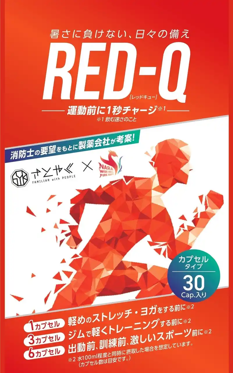 | 「RED-Q」は2025年6月に奈良県広域消防組合消防本部との包括連携協定に基づき共同開発したカプセルタイプのサプリメントです。消防士の方々から寄せられた「出動前や訓練前に、後味を残さず素早く塩分補給できるものがほしい」という声かをきっかけに誕生しました。 | |||
