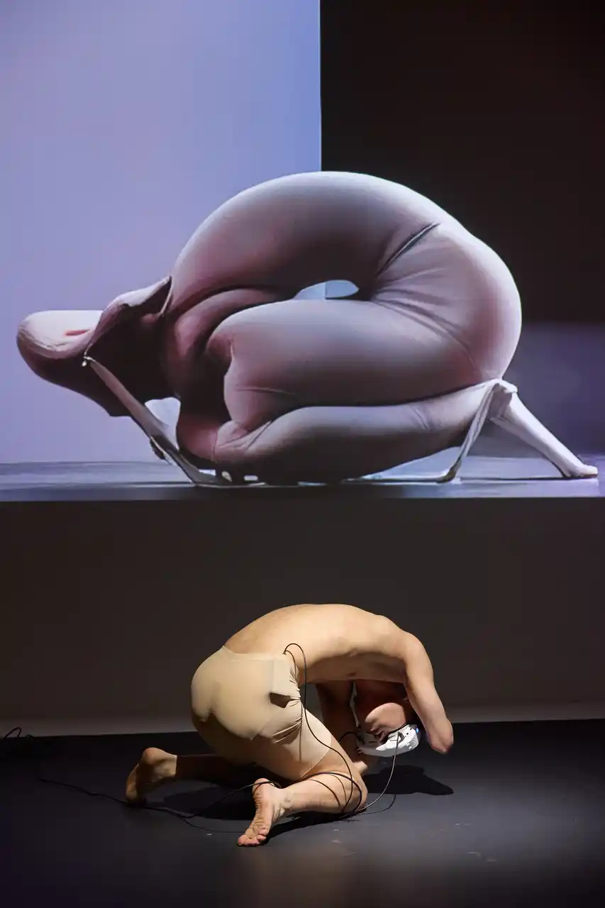 本パフォーマンスでは、構造とイメージの双方から「椅子になる」ことを試みる。他者に座られ軋む骨格と、画像生成AIによってリアルタイムに変換される身体像は、既存のシステムに組み込まれる人間と人工物との関係を〈捻転〉させ、その境界を揺らぐ未規定の存在〈エルゴノミクス胚〉へと接近する。 |