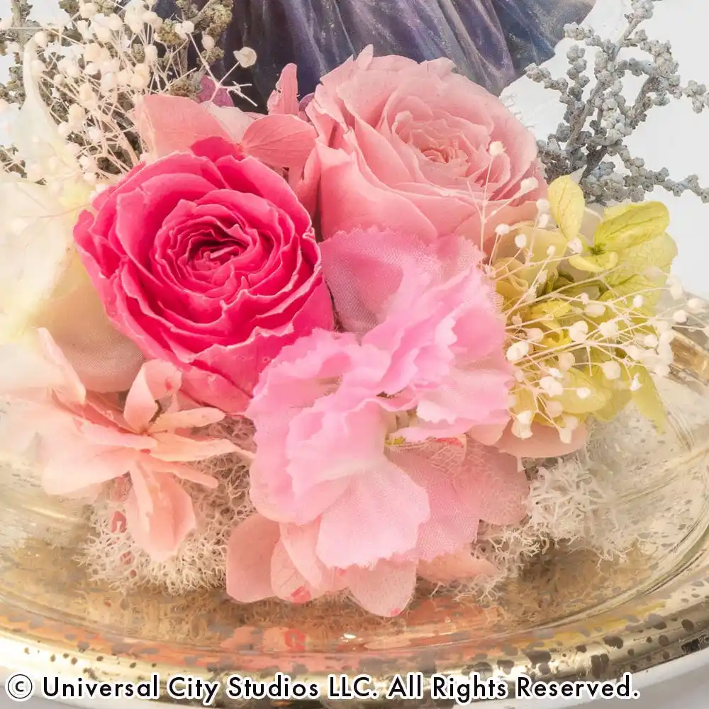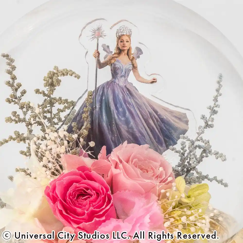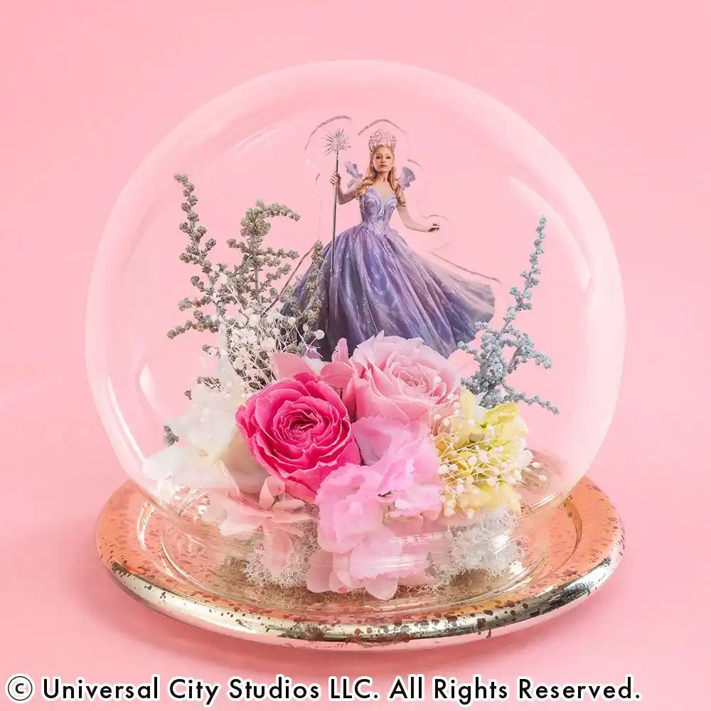 お部屋に「可愛い!」の魔法をかけて。みんなが大好きになる、グリンダの弾ける魅力をピンクの花々で表現しました。ガラスドームの中でキラキラと輝く姿は、まるで彼女が振りまく魔法の粉のよう。飾るだけでお部屋がハッピーな空気に包まれる、ご褒美感たっぷりのフラワーアイテムです! |