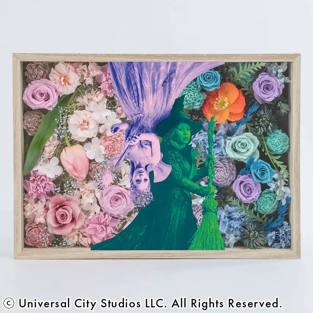 世界は、見る角度で変わる。二人の魔女が共演する、驚きの魔法。今回のコラボで最も贅沢な、スペシャルデザインが登場!最大の特徴は、フレームを逆さにすると、エルファバとグリンダそれぞれの世界観が主役として楽しめる仕掛け。 「物語をどちらの視点から見るか」で表情が変わるこのフレームは、まさに映画『ウィキッド』の深さを花で表現した唯一無二のアートです。 二人の絆を象徴する鮮やかなコントラストをお部屋に迎えて、その日の気分で魔法を掛け替えてみてください。 |