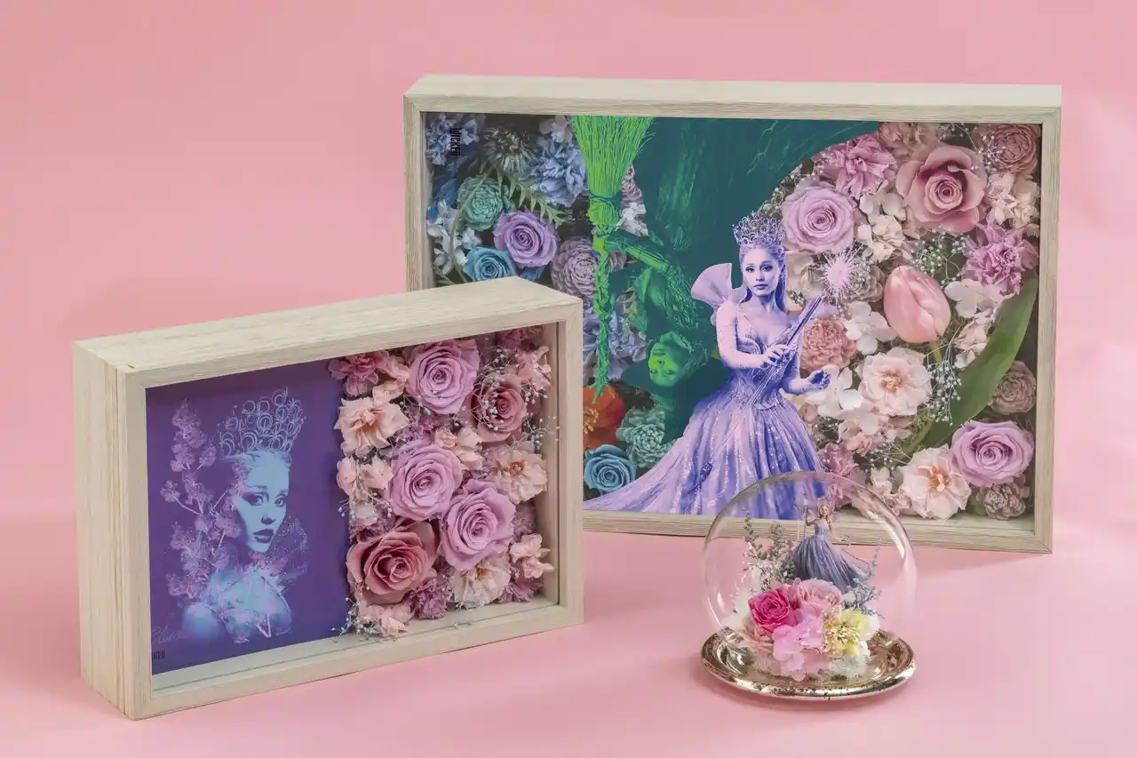 ラインアップは、デスクや棚などお好みの場所に飾って映画の感動をいつでも身近に感じられるアレンジメントタイプと、壁掛けとしても楽しめるフレームアートタイプを合わせた全5種類。物語の風景が目の前に広がるような、作品の世界に没入できるこだわりが詰まった逸品です。すべてここでしか手に入らないファン必見のウィキッドアイテム。飾るとたちまち物語のドラマティックな世界広がるフラワーアイテムを、ぜひこの機会にお楽しみください。 |