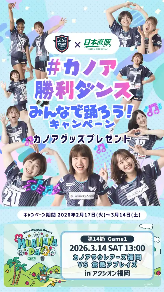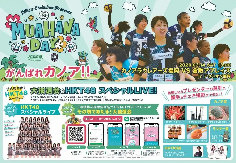 日本直販株式会社(本社:東京都港区、代表取締役社長 水谷 彰孝/以下、日本直販)は、これまでの総合通販から「エンタメ、グローバル、DX・デジタル」を軸に“総合サービス(WEB3.0)”企業へ進化する取り組みの一環として、出資先の女子プロバレーボールチーム「カノアラウレアーズ福岡」の冠試合『日本直販PRESENTS MUA HANA DAY』(2026年3月14日・アクシオン福岡)における、当日企画の詳細を公開します。日本直販は第1弾で冠試合開催、第2弾でHKT48のゲスト出演決定を発表しており、第3弾となる今回は、X・TikTok・LINE・NFC・QRを掛け合わせた“試合前・試合後まで続く観戦体験”の詳細をお知らせします。 |