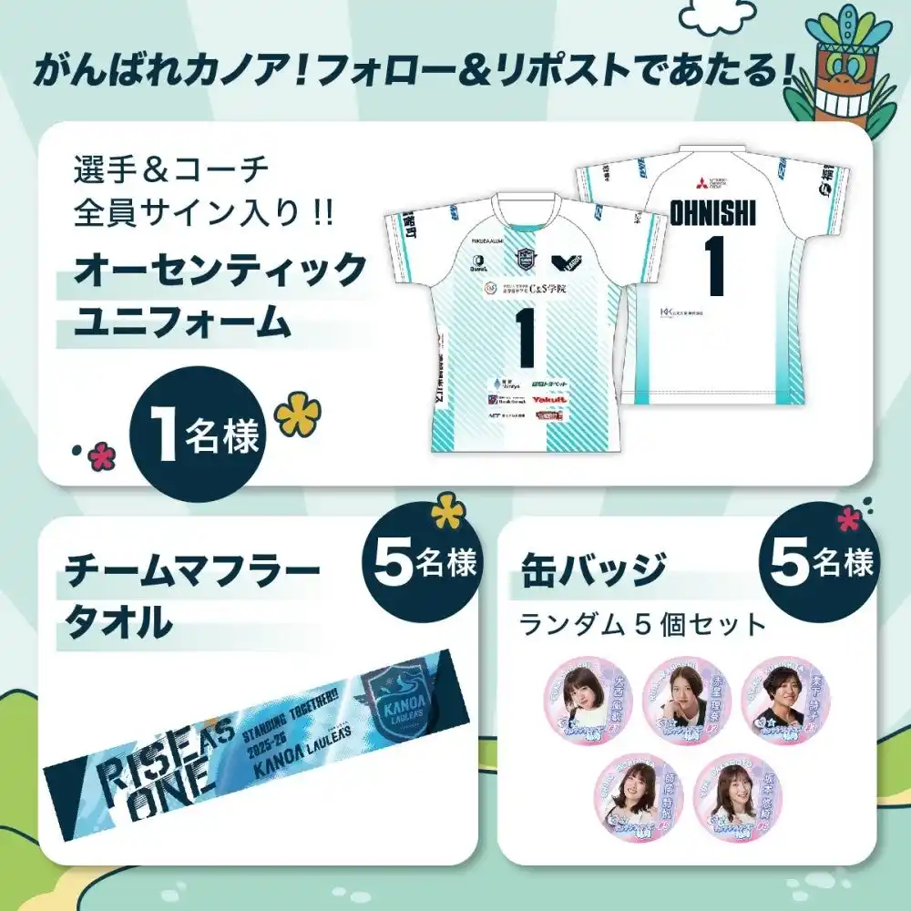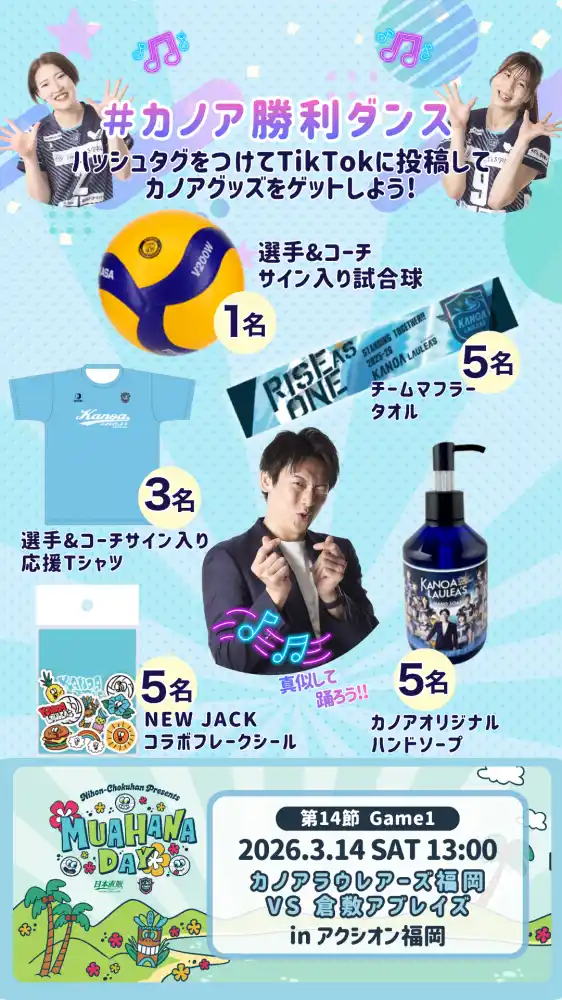 TikTokでは、カノアラウレアーズ福岡公式アカウントおよび日本直販公式アカウントで配信する「#カノア勝利ダンス」を真似して投稿した方の中から、抽選で19名にカノアグッズをプレゼントします。SNS上の参加そのものを観戦体験の入口にし、会場来場前から熱量を高めてまいります。 |