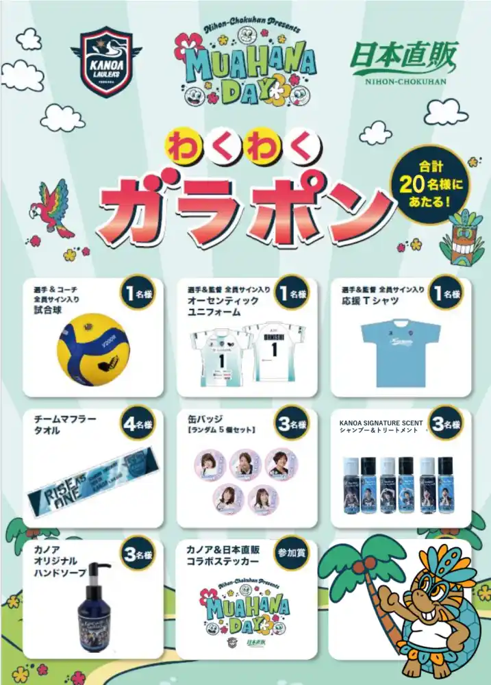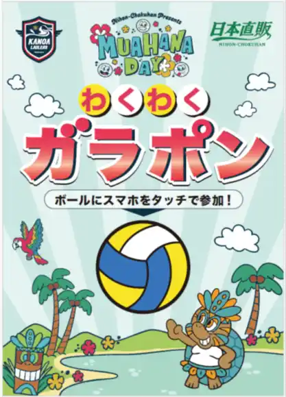 試合開始前には、日本直販ブースで無料参加型の「カノアラウレアーズ福岡 OLIOLIガラポン」を実施します。会場内に設置されたバレーボールにスマートフォンをタッチするとガラポンアプリが自動で起動し、その場で抽選結果が表示される仕組みで、抽選で20名に日本直販オリジナルグッズやカノアグッズが当たります。ハズレなしで、家族や友人と一緒に楽しめる参加型企画として展開します。 |