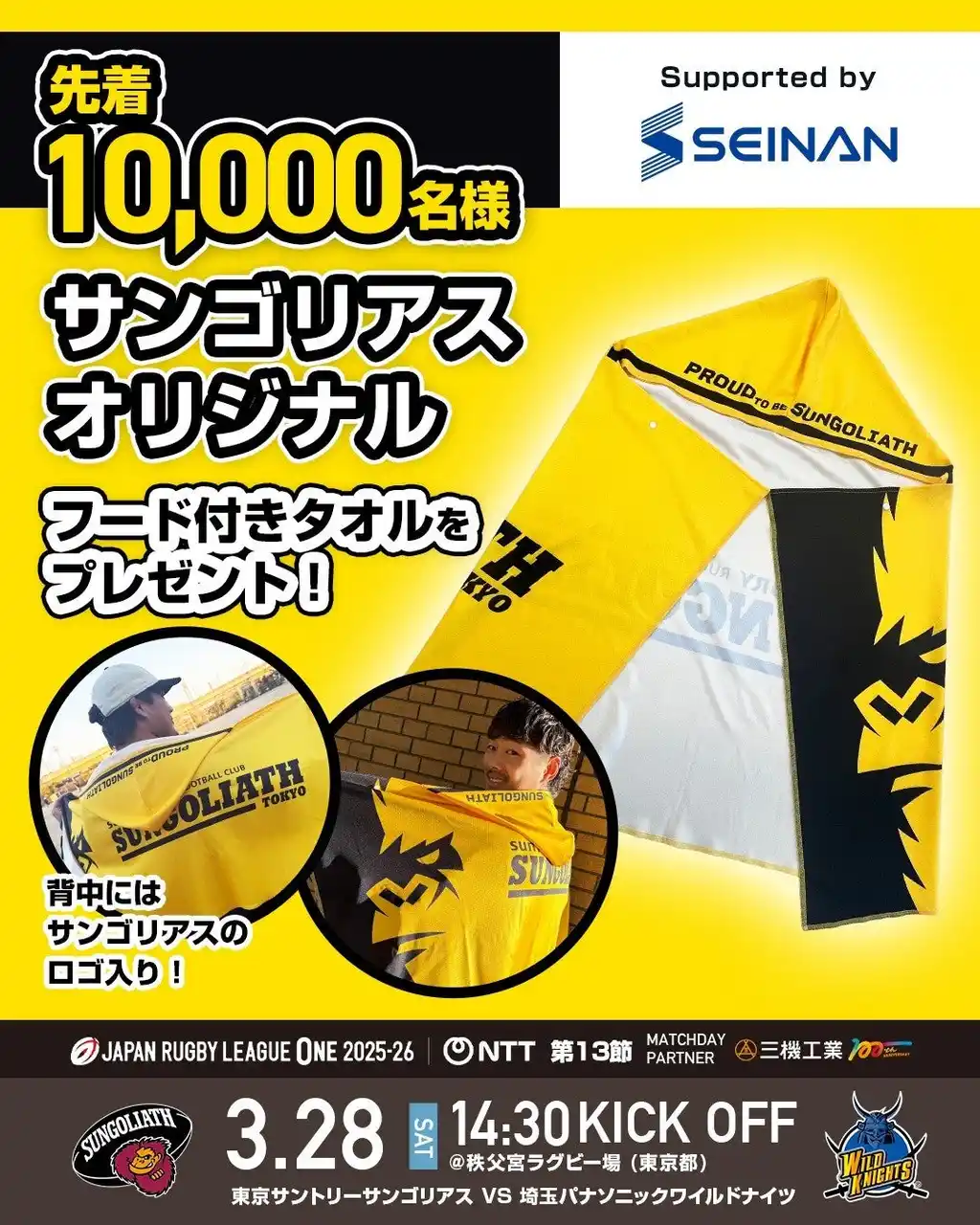 東京サントリーサンゴリアスは、2026年3月28日(土)開催のホストゲーム「NTT JAPAN RUGBY LEAGUE ONE 2025-26 第13節 埼玉パナソニックワイルドナイツ戦」を、三機工業株式会社をマッチデーパートナーに迎え、「『人に快適を。地球に最適を。』三機工業マッチデー」として実施いたします。 |