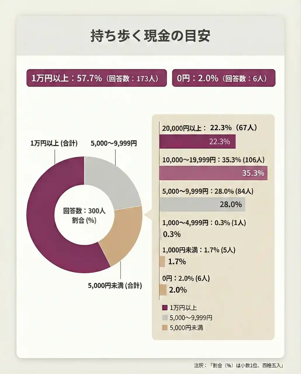 | 【結果3】現金は「1万円以上」を持ち歩く人が57.7%(173人)。キャッシュレス化が進んでも現金は一定額携帯 | |||