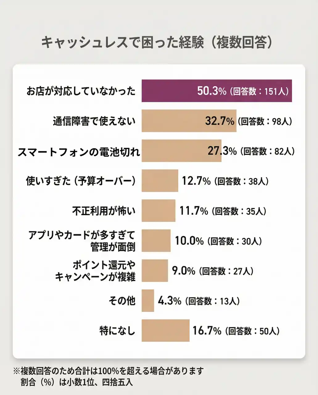 | キャッシュレス決済で困った経験を聞いたところ(複数回答)、「お店が対応していなかった」が50.3%(151人)で最多となりました。次いで、通信環境や端末の状態など、インフラ・機器に起因するトラブルが上位に挙がりました。 | |||