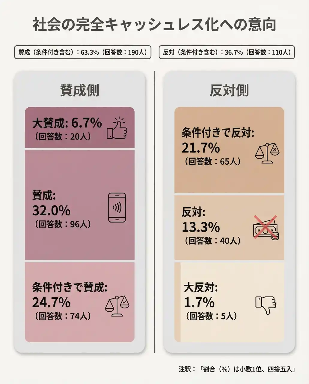 | ・社会の完全キャッシュレス化は賛成(条件付き含む)63.3%(190人)、反対(条件付き含む)36.7%(110人) | |||