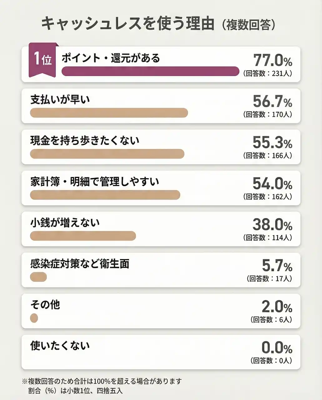 | ・利用理由TOPはポイント・還元がある77.0%(231人) | |||
