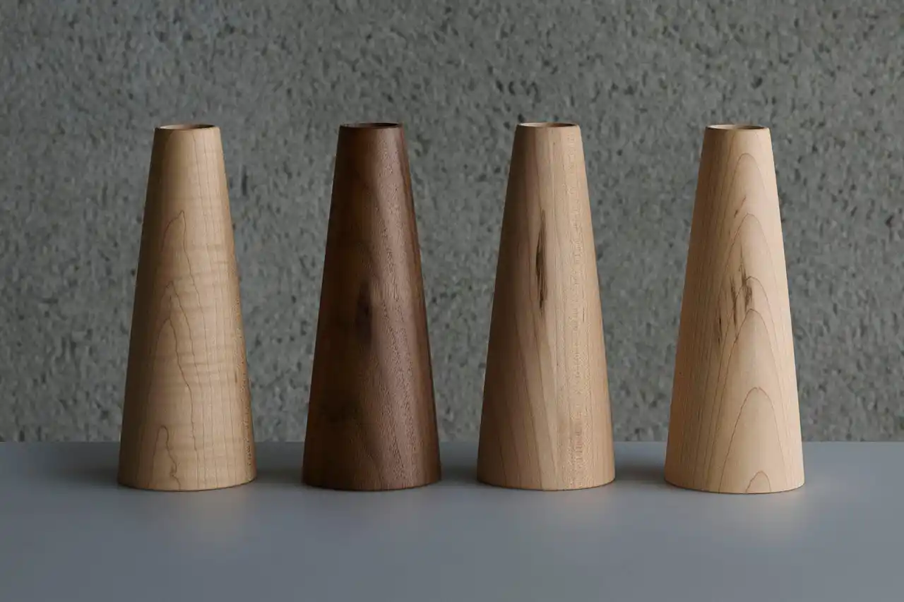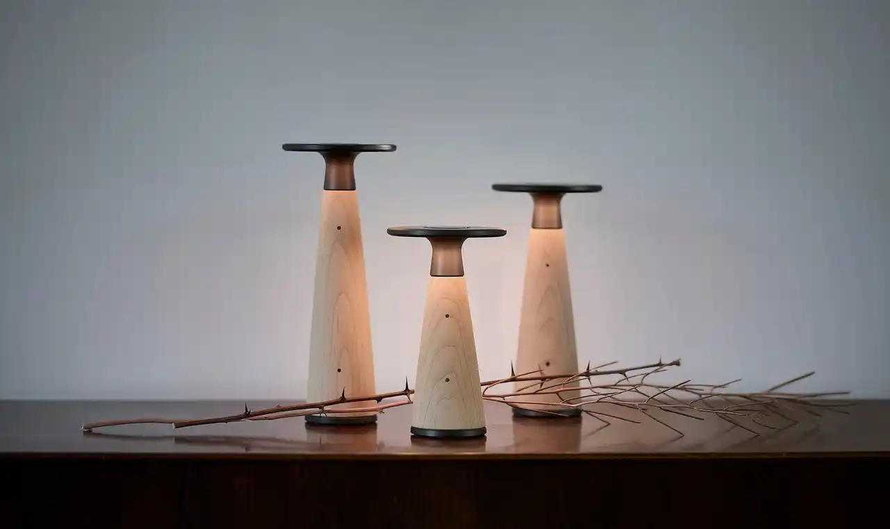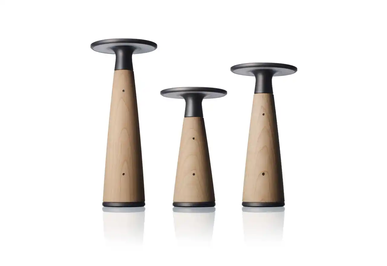 Voscoは、木に負担をかけない内部構造を採用し、パーツごとの修理や交換が可能な設計になっています。さらに用途やシーンに合わせて、中心の木の部分を大・中・小の3つのサイズに切り替えられるほか、メープル、ウォルナットの2種類の木材から選ぶことができ、長く使い続ける中で交換することも可能です。使う人の暮らしが変化しても、ずっと寄り添い続ける光でありたい。そんな想いを込めたデザインです。 |