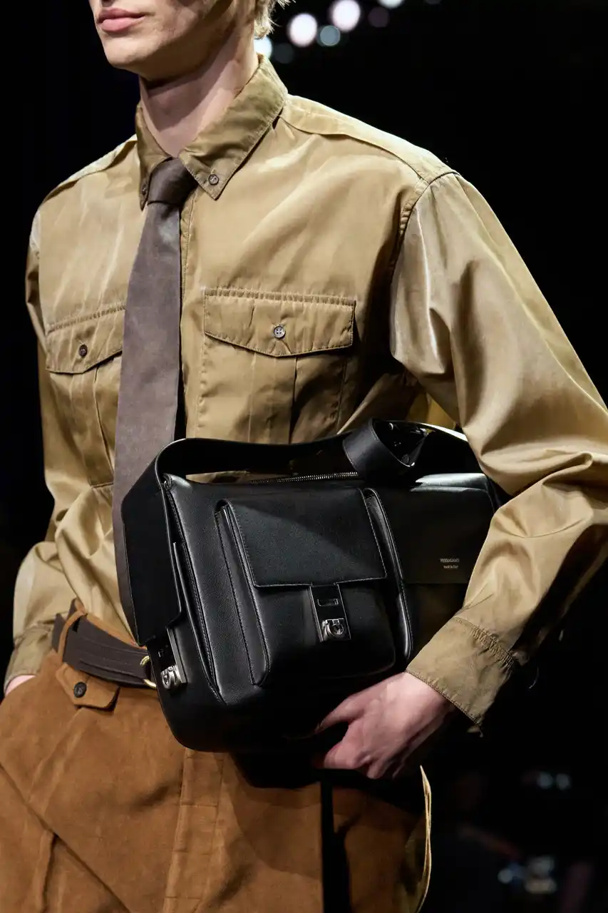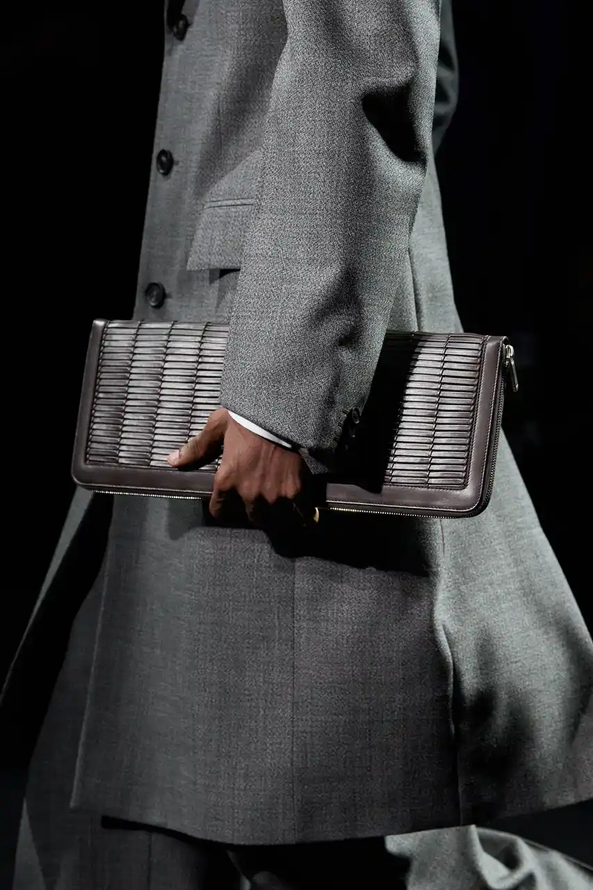 メンズでは、実用性の高いクロスボディのポケットバッグや、編み込みカーフレザーを採用した「ハグ」ポーチもラインナップする。 |