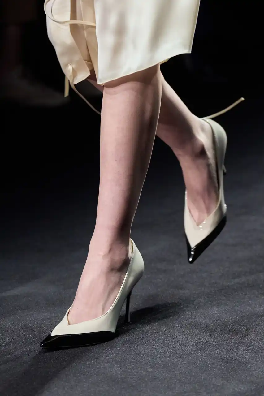 フットウェアでは、1954年にサルヴァトーレ・フェラガモがデザインしたフラットシューズに着想を得た、深いヴァンプの新作ポインテッドスティレットとスリングバックが登場し、船員服を想起させるカラーブロッキングやジュエル装飾が施されている。また、1950年代にサルヴァトーレが開発した、足を包み込むようにソールが巻き上がる技法 「シェルソール」の構造をもとに、ウェッジヒールと融合した曲線的なサンダルが誕生した。 |