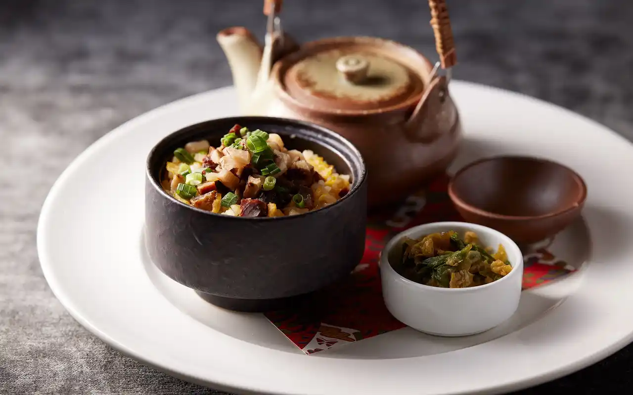 いぶりがっこと、自家製の窯焼き叉焼を加えた炒飯です。 いぶりがっこの歯切れのよい食感と、香ばしく焼き上げた叉焼の旨みが調和します。 添えた上湯は、そのまま味わうほか、炒飯にかけて、味わいの変化もお楽しみいただけます。