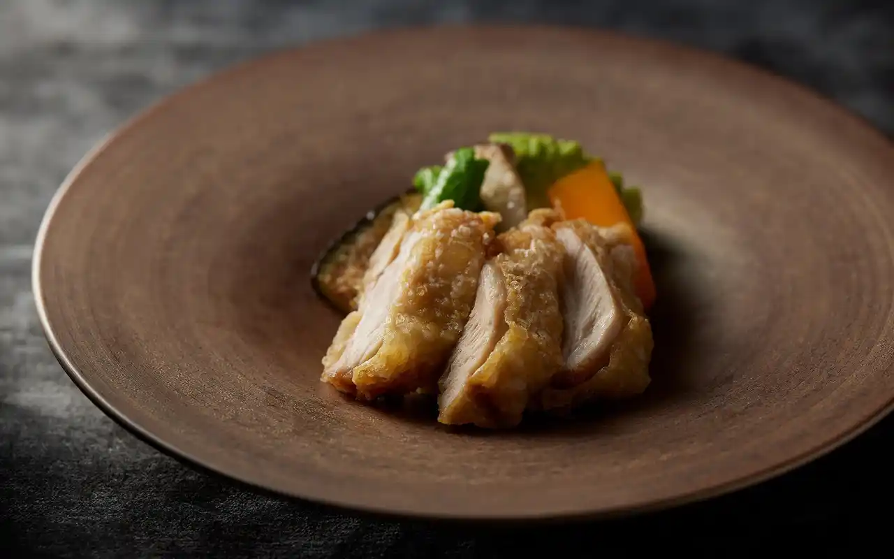 秋田県産の比内地鶏を、軽やかな衣で揚げました。 しっとりとした肉質と、噛むほどに広がる旨みが特徴です。 香味野菜の風味をきかせた特製ソースが、比内地鶏の味わいに奥行きを与えています。