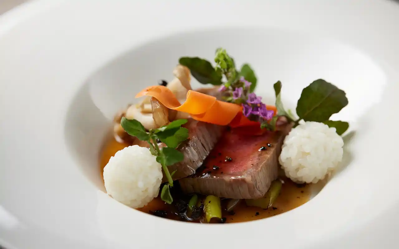 黒毛和種秋田牛サーロインを、さっと湯通しするようにポシェ。 比内地鶏の旨みをいかしたソースにトリュフの香りを添え、秋田の郷土料理「だまこ鍋」をイメージした、だまこもちとともに仕上げています。