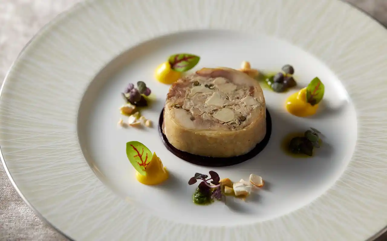 秋田県産比内地鶏のガランティーヌとルビーポルト酒のジュレ 大葉のピューレとサフランマヨネーズ |