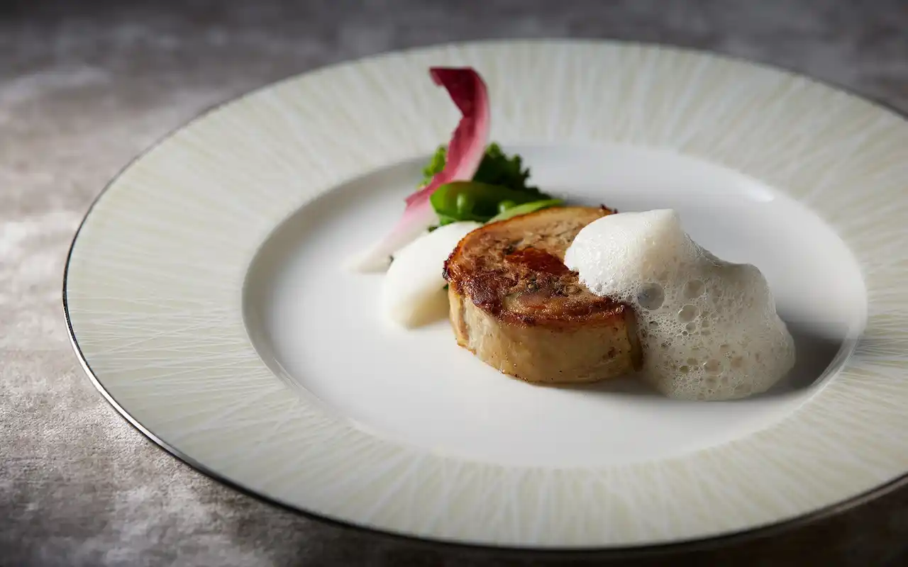 秋田県産比内地鶏を、温製のバロティーヌでご用意しました。 鶏がらの旨みをいかしたクリームベースのシュプレームソースに、味噌の風味を重ね、泡立てることで軽やかに仕上げています。