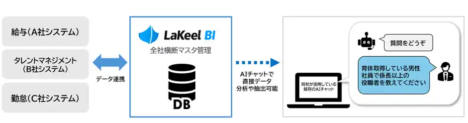 今回のLaKeel BI導入により、分散していた人事・業務データを統合し、全社共通で活用できるデータ基盤の整備を進めます。まずは、システムや部門ごとに分断されていた情報を一元管理することで、データ取得や突合作業にかかる負荷を軽減し、迅速かつ的確な意思決定と業務効率化を実現します。あわせて、誰もが同じ条件・切り口でデータを活用できる環境を整えることで、属人化の解消とデータ活用の平準化を図ります。さらに、AIチャットとの連携により、分析や情報活用の利便性向上を実現します。 |