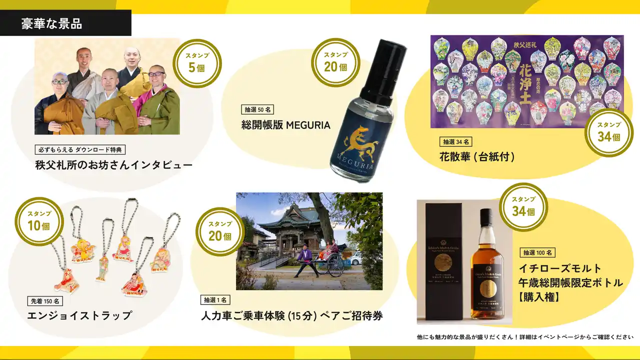 景品例)ウイスキー限定ボトルの購入権、宿泊券、特産品、秩父札所関連記念品など |