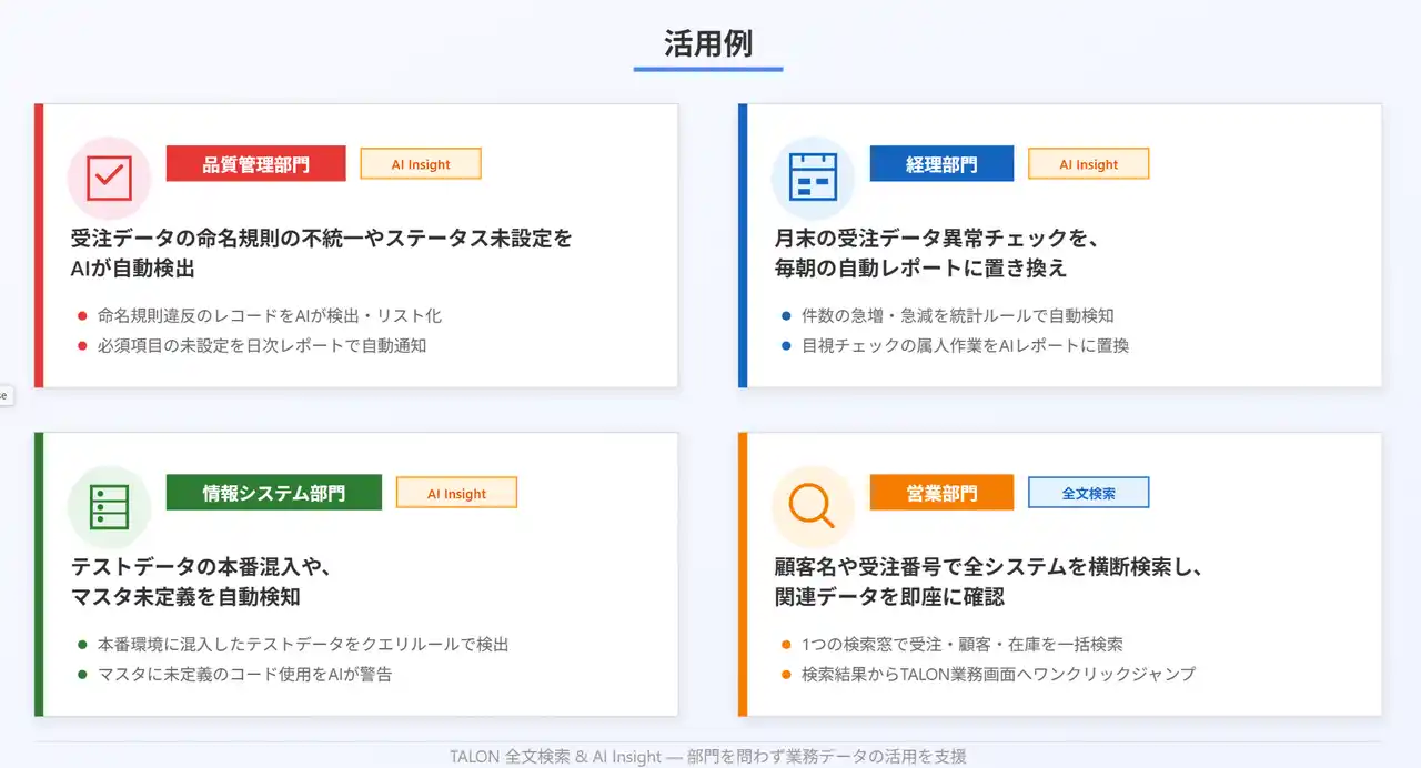 品質管理部門: 「受注データの命名規則の不統一やステータス未設定をAIが自動検出」 |
