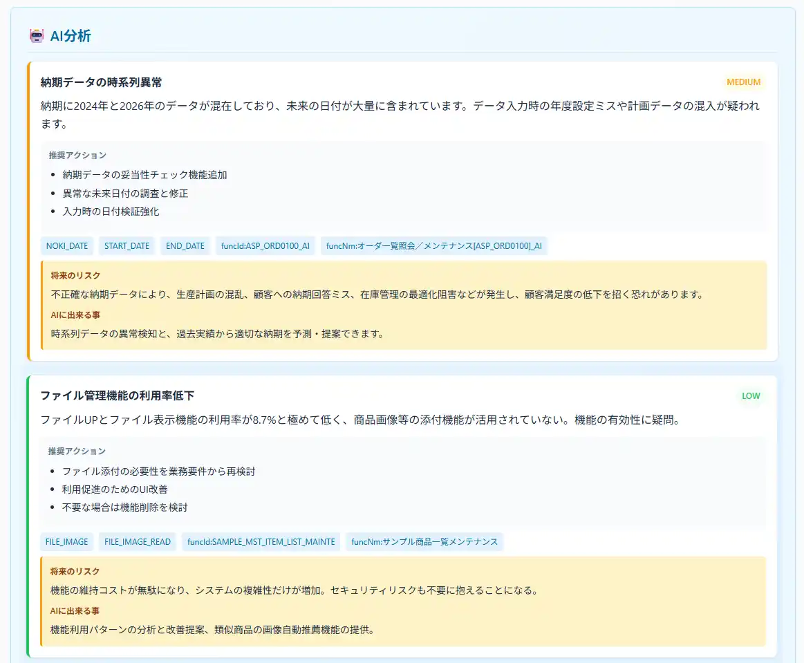 AI Insight: インデックス化した集計機能とAI(Claude API)を活用し、異常検知・傾向分析レポートを自動生成 |