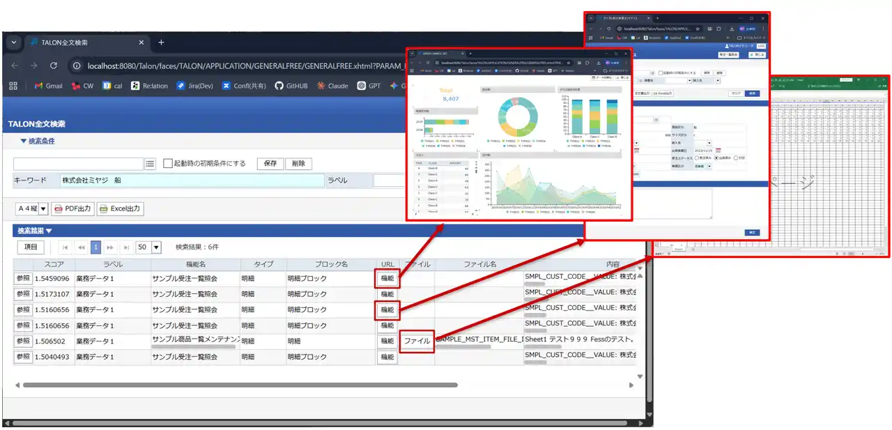 TALON全文検索画面と、検索結果から各業務画面へ遷移するイメージ |