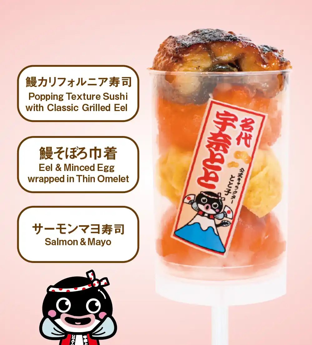 ニューヨークなど海外で見られる、カップから押し出して食べる寿司スタイル。 そのユニークな食べ方に着想を得て、宇奈とと自慢の鰻を主役にしたてまり寿司としてアレンジしました。 |