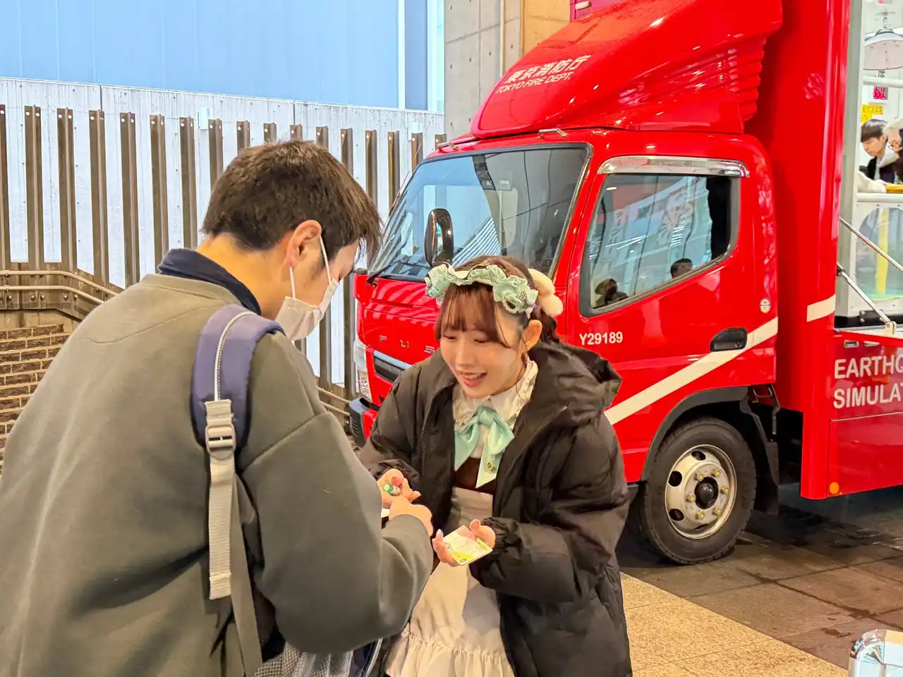 また、3月3日(火)には秋葉原電気街口駅前広場にて、神田消防署主催の防災イベントが開催され、あっとほぉーむカフェのメイドスタッフも広報活動や来場者案内などのサポートスタッフとして参加しました。 |
