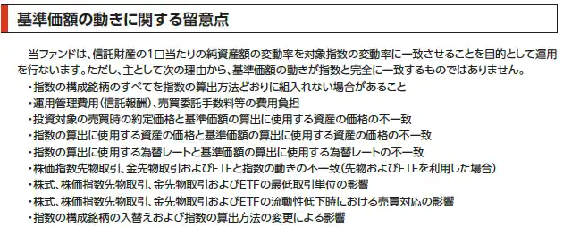 投資信託は値動きのある有価証券等に投資しますので、基準価額は大きく変動します。したがって、 投資元本が保証されているものではありません。信託財産に生じた利益および損失はすべて投資者に帰属します。投資信託は預貯金とは異なります。 |