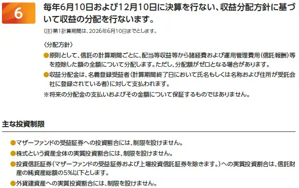 分配金額は収益分配方針に基づいて委託会社が決定します。あらかじめ一定の額の分配をお約束するものではありません。分配金が支払われない場合もあります。 |