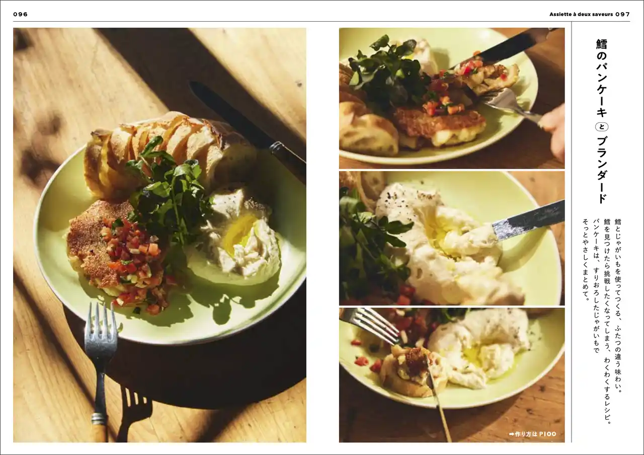 こちらは鱈とじゃがいもを使ったワンプレート。なんと、鱈のパンケーキもブランダードも、同じ鱈とじゃがいもからできています。買い物をする手間や下ごしらえをする時間は少ないのに、2通りの料理ができあがるという、タイパに優れた調理法です。 |