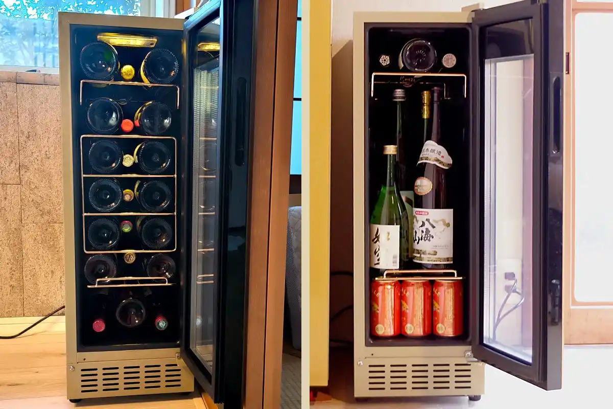 日本酒、ワイン、シャンパン、ビールなど幅広いお酒に対応できるよう、『サカリュエ -盃-』は取り外し可能なラックを採用しました。レイアウトを自由に組み替えることで、日本酒愛飲家なら一升瓶5本・四合瓶1本・ワインボトル3本・缶ビール15本、ワイン愛飲家ならワインボトル最大21本まで収納可能。 |