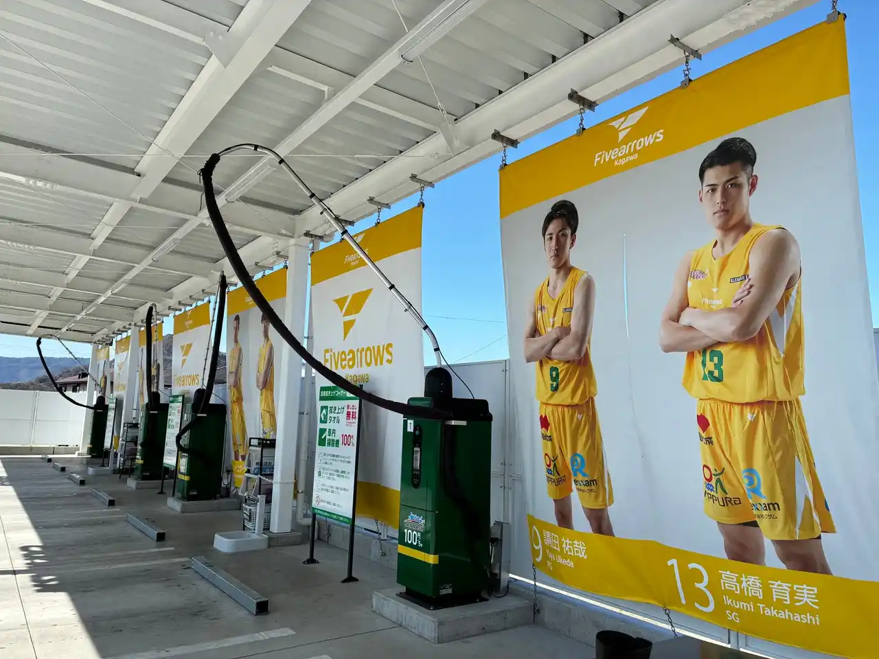 ヤマウチセルフ高瀬は、バスケットボールチーム「香川ファイブアローズ」を応援する特別装飾を実施し、店舗全体がファイブアローズカラーに装飾されています。 |