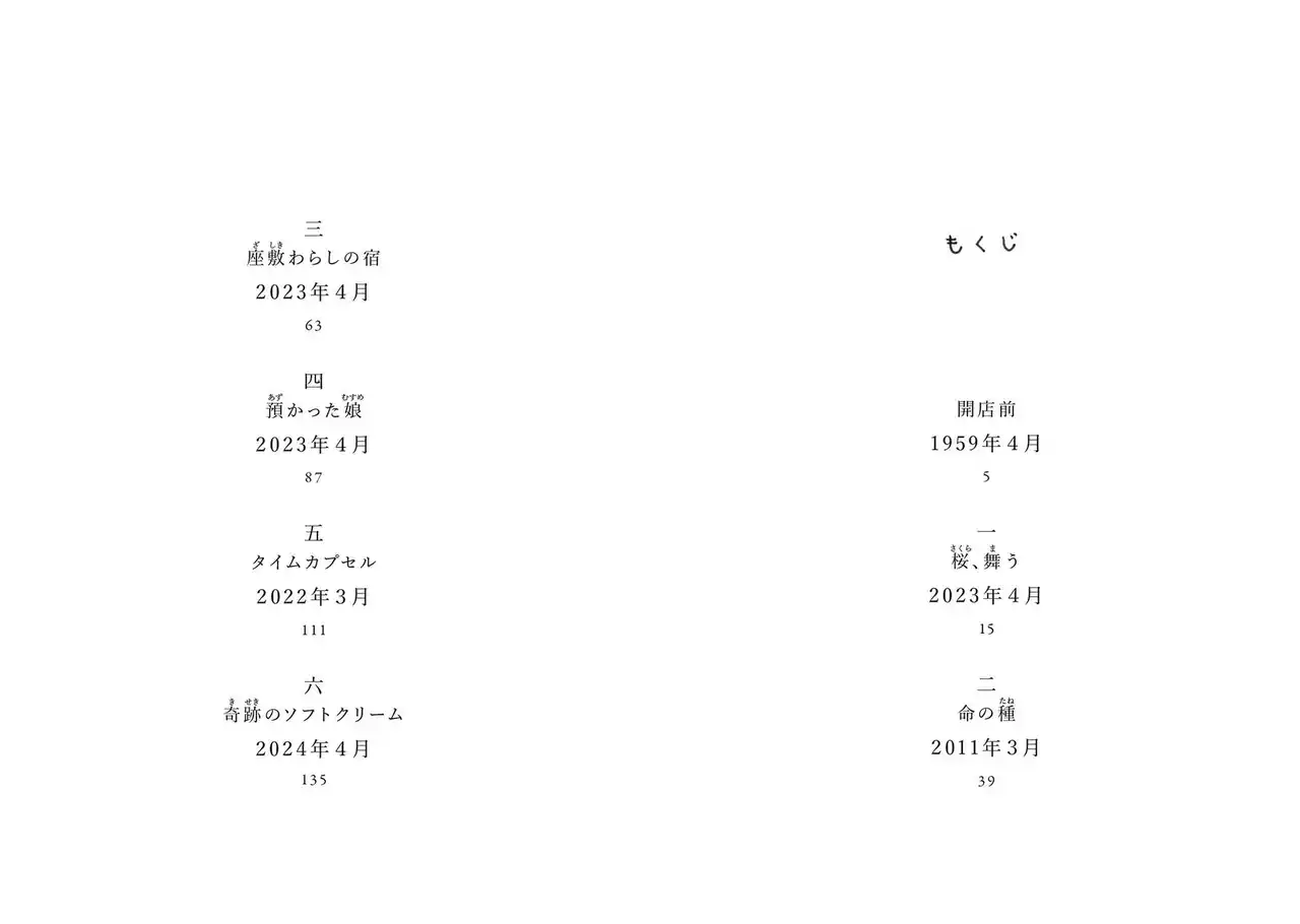 【収録作品】 開店前──1959年4月/一、桜、舞う──2023年4月/二、命の種──2011年3月/三、座敷わらしの宿──2023年4月/四、預かった娘──2023年4月/五、タイムカプセル──2022年3月/六、奇跡のソフトクリーム──2024年4月 |