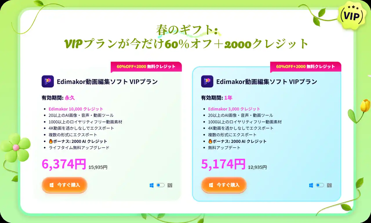 HitPaw Edimakorは2026年3月3日16:00~3月16日16:00までの期間限定「春セール」を開催します。 VIPプラン・AIクレジットは最大65%OFF、さらに最大2,000クレジットの無料特典付き。春の動画・画像制作をよりお得に体験できるチャンスです。 |