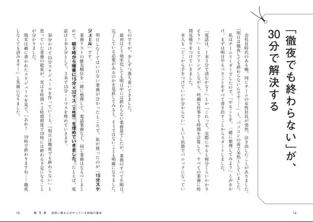 会社員時代のある晩、チームメンバーが「明日は徹夜をしても業務が終わらない!」と泣きじゃくり始めて手が付けられない状態になった時に、業務を分解して15分単位で予定に落とし込む方法を実践。短時間で業務を前に進める手応えを得たことから、再現性のある手法として体系化した。 |