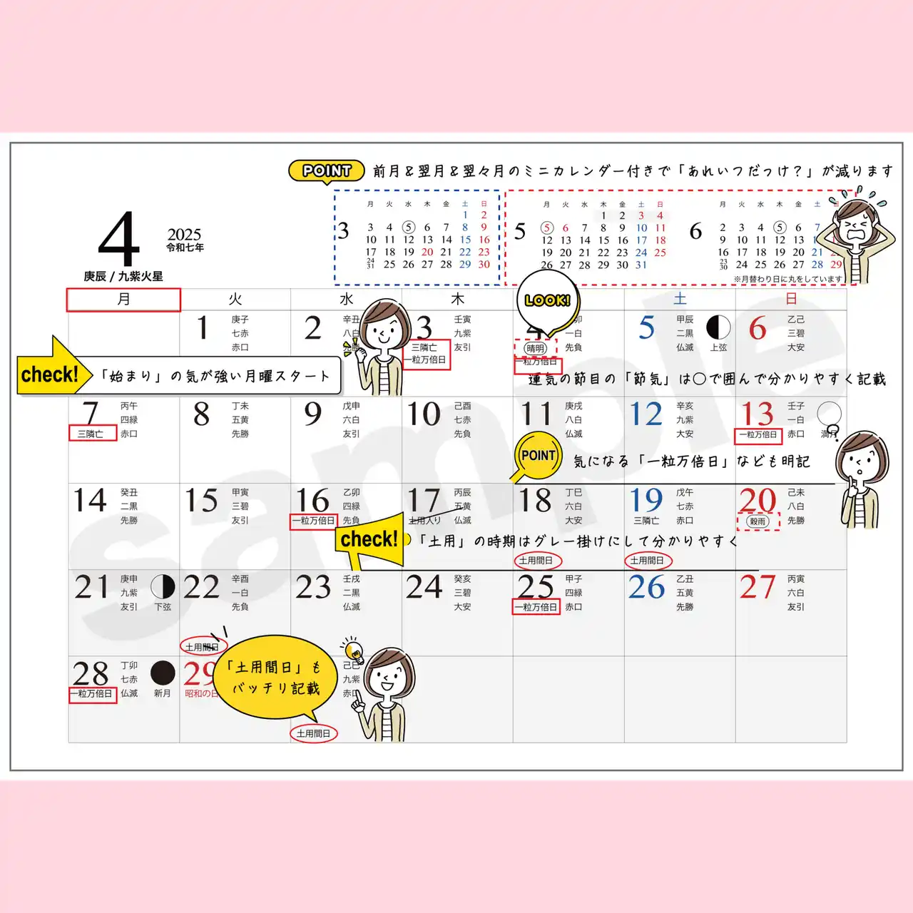 六曜・干支・九星・土用・二十四節気・一粒万倍日・天赦日などの暦情報を掲載した人気カレンダーシリーズ。卓上版に加え、より多彩な暦情報を収録した壁掛け版も展開しています。 |