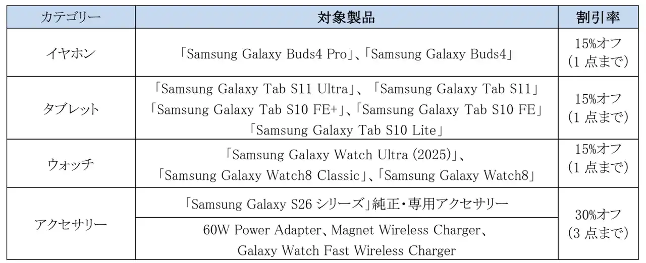 対象期間中にSamsungオンラインショップ、Galaxy Harajuku、Galaxy Studio Osakaで「Samsung Galaxy S26」「Samsung Galaxy S26+」「Samsung Galaxy S26 Ultra」(SIMフリーモデル)と同時購入すると対象製品が最大30%オフになるキャンペーンを実施いたします。 |