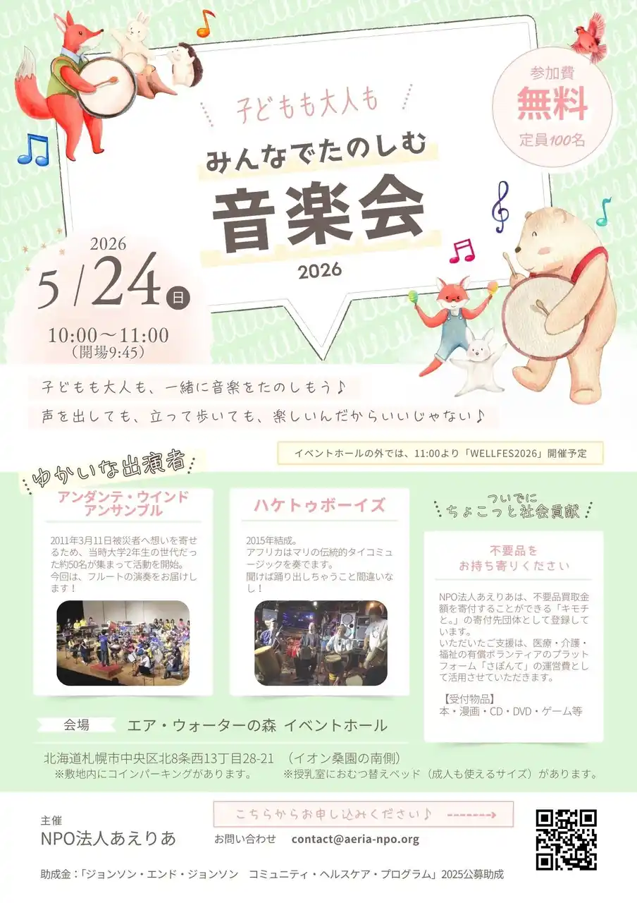 | 今回の音楽イベントは、近隣の家庭向けマンション、児童会館、支援学校、放課後等デイサービス、フードバンク、片親世帯を支援しているNPOなどにも告知のご協力をいただき、日常生活で接点を持ちにくい子ども達とその親が一緒に楽しめる場を提供します。 | |||