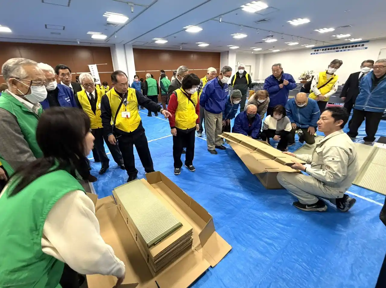 この度、安芸郡4町合同となる海田地域公衆衛生推進大会において、防災意識の向上と避難所環境の理解促進を目的に、段ボールベッドの展示と組み立て体験を実施しました。 |