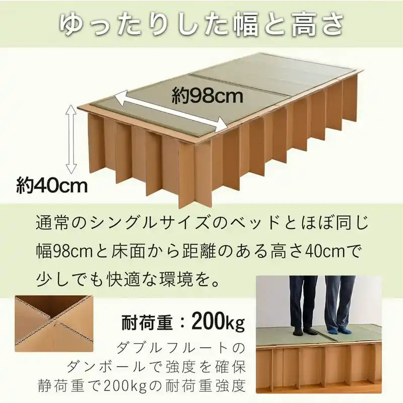 「段ボールベッドの上に置く畳シートが安心感があって良い」 |