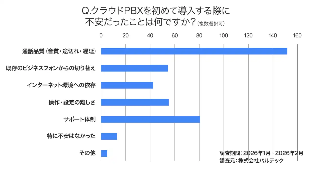 | 調査の結果、最も多くの企業が不安視していたのは「通話品質(83.4%)」でした。次いで「サポート体制(44.2%)」、「操作・設定の難しさ(30.4%)」が挙げられており、導入後の安定稼働や運用面でのバックアップを重視する傾向が目立ちました。 | |||