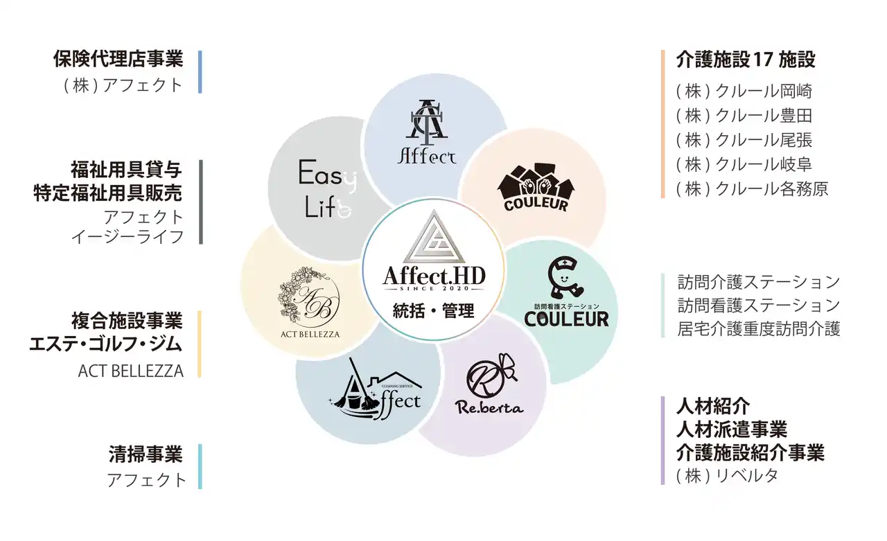 サービス付き高齢者向け住宅や住宅型有料老人ホームなど介護施設17施設をはじめとしてパーソナルジム、インドアゴルフ、エステなどを運営。 2011年岡崎市に(株)ビバントとして愛知県岡崎市に創業。介護施設を中心に店舗展開を続け、2024年複合施設ACT BELLEZZAをオープン。企業理念の「Happiness A Lot」をキーワードに事業展開を続ける。 |