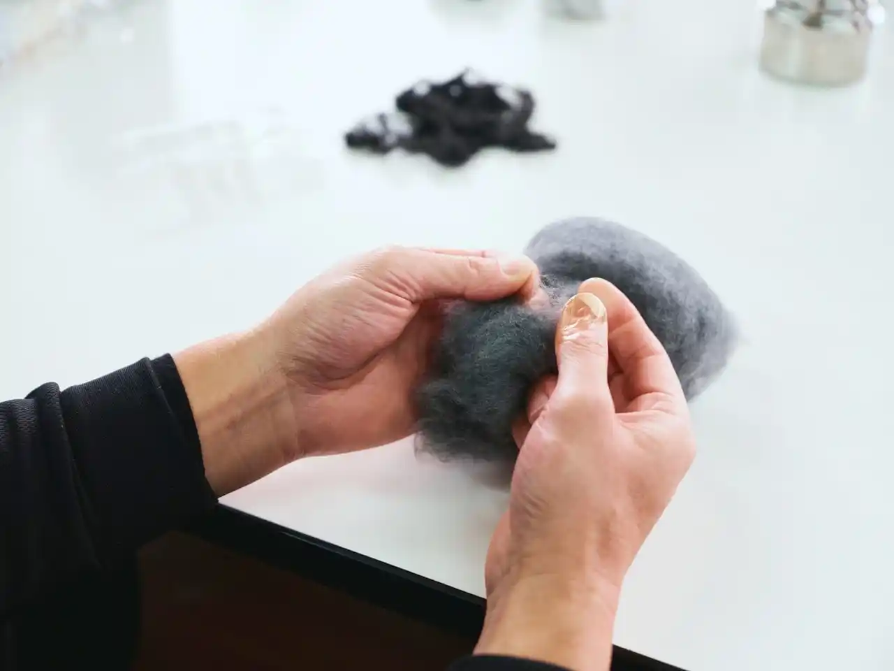 ニュージーランド産スーパーエクストラファインメリノ(NZ-175)という最高級ランクの原料を使用。福井県内で発生した販売機会を失った別注ポリエステルテープを熱溶解しペレットに再成形、ウールの繊度と繊維長に合わせた原料(1.7d/64mmカット)を30%混紡しました。一般的に、このクラスの高級ウールにポリエステルを混紡するケースは多くありません。しかし、あえて30%を掛け合わせることで、以下の特性を実現しました。 |