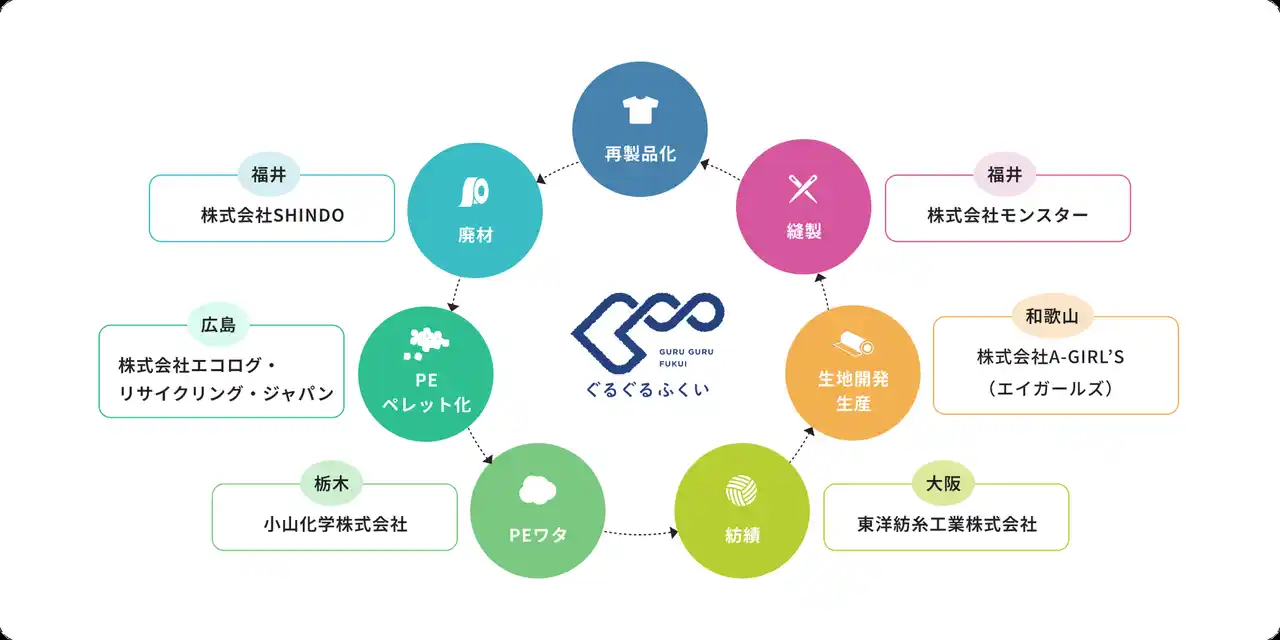 この地域的制約を乗り越えるため、一般社団法人ぐるぐるふくいを中心に、株式会社SHINDO(福井)、株式会社モンスター(福井)、株式会社エコログ・リサイクリング・ジャパン(広島)、小山化学株式会社(栃木)、東洋紡糸工業株式会社(大阪)、株式会社A-GIRL’S(エイガールズ)(和歌山)の産地を超えた企業が連携しました。福井県内で発生するポリエステル系繊維の生産ロスを回収し、マテリアルリサイクル技術によって再び“糸”へと再生。さらに他産地の紡績技術と組み合わせることで、混紡素材による高付加価値な糸の開発を可能にしました。 |