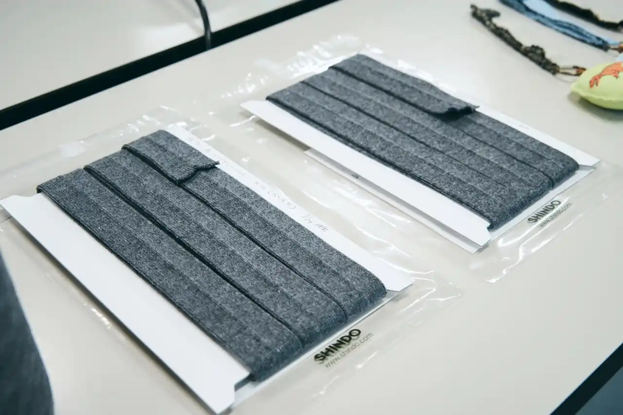自社製品を製造する過程で発生するロス材を、再び自社製品の原料として循環させる取り組みも行っています。副資材メーカー SHINDO で生じたロス材を原料としてマテリアルリサイクル糸を生産し、それを再び SHINDO へ戻し、既存ラインナップの ウールニットバインダーテープ に置き換えることができました。“廃棄物ではなく資源”として循環させる、新しい活用方法の実証です。 |